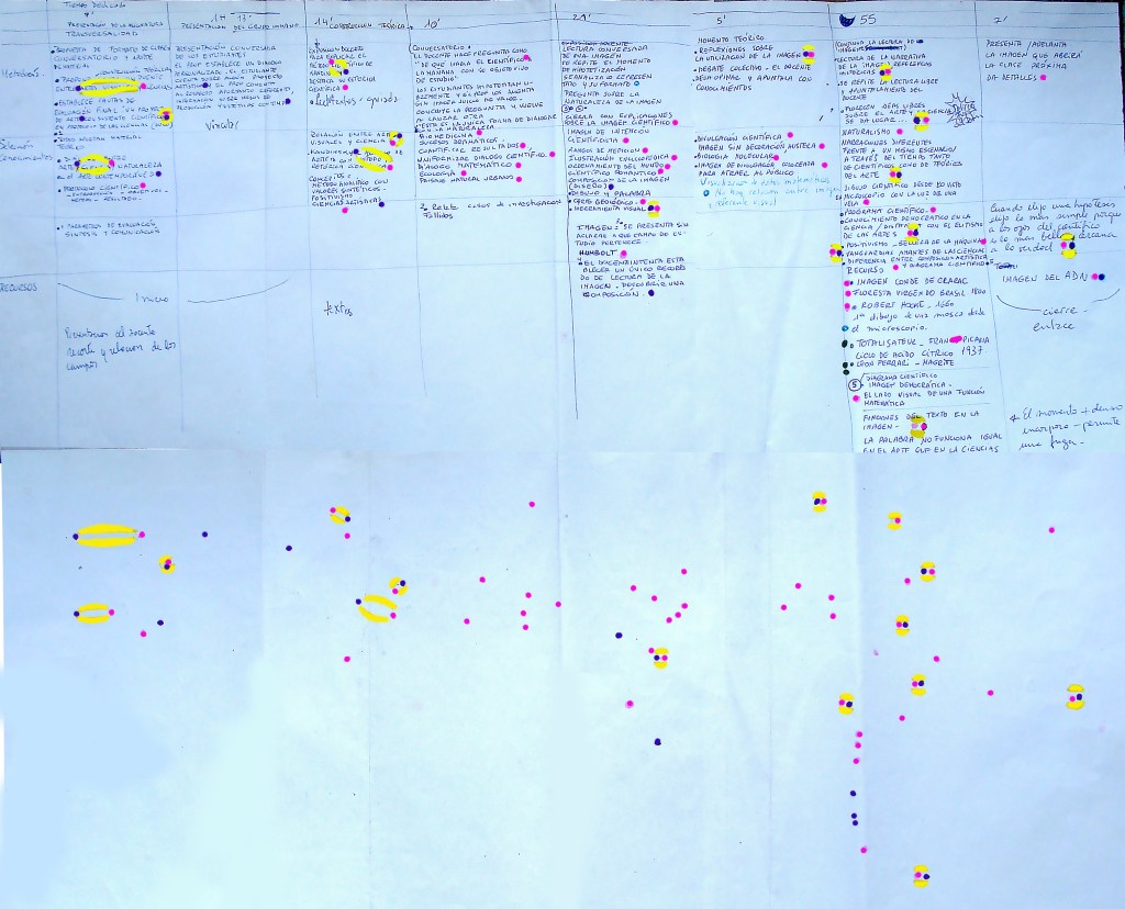 El primer paso fue hacer registros audiovisuales de las clases para después transcribirlas en una primera plantilla/ borrador. Después de varios ensayos surgió visualmente la idea de una herramienta temporalizada y sonora.