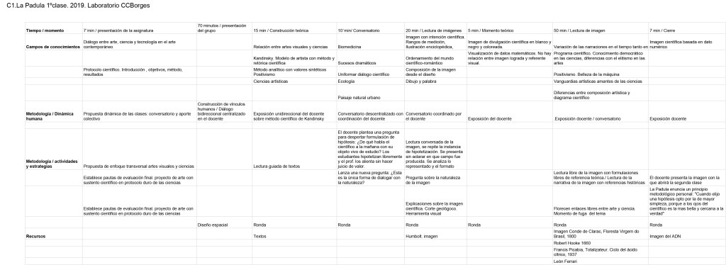 A partir esta idea inicial, diseñamos una herramienta para registrar las experiencias educativas a la que llamamos partitura de clase con la que registraríamos cada momento de la clase con su duración, conocimientos transdisciplinares y metodologías. En una primera instancia se identifican los elementos de la clase y se realiza el 1* nivel de transcripción.