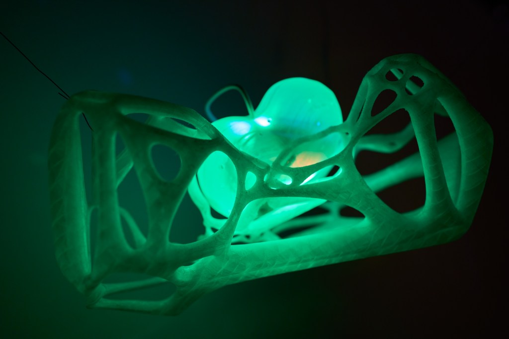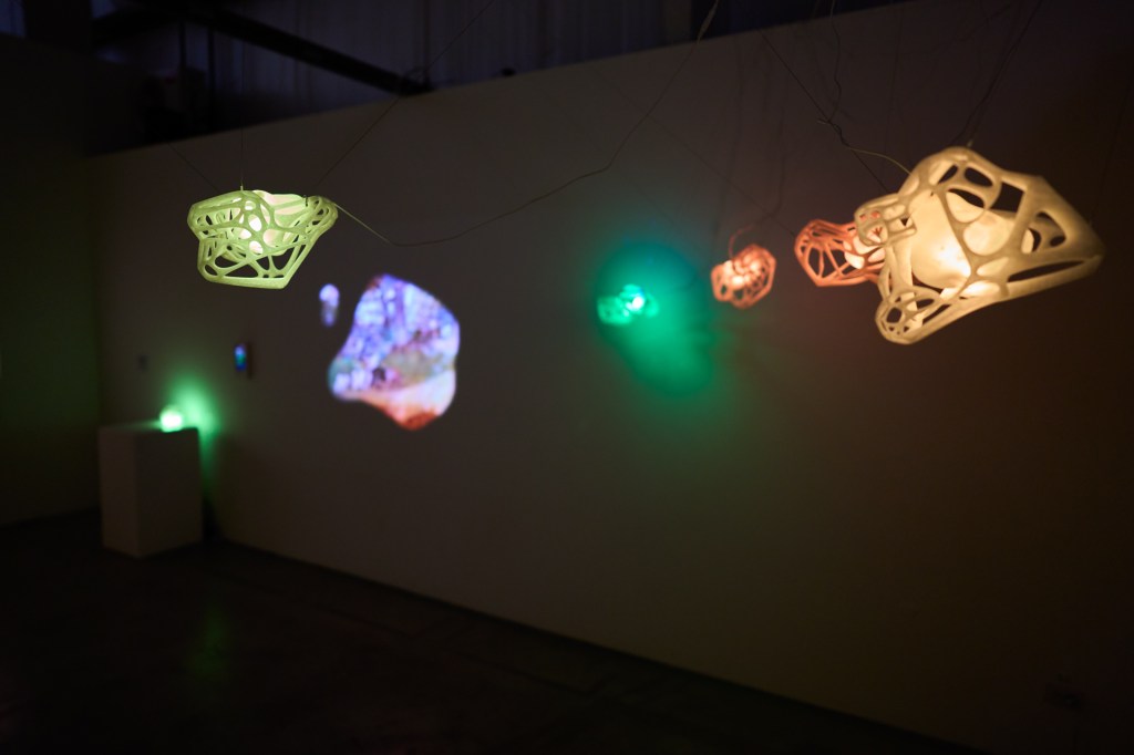 Respiro Namiki is an aesthetic, bioactivist, and sensory experience of everyday life. Its system is comprised by models generated from biodata and collaborative virtual atmosphere nested on the web. The shapes of the models, as well as the projected lights, emerge from the sensing of vital events. The embedded device in them monitors the concentration of carbon dioxide (CO2) in the air, this chemical compound being one of the main indicators of pollution and long-term impact.